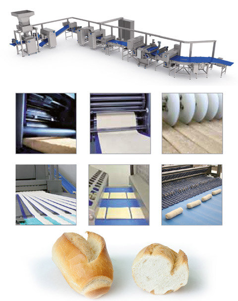 The Pao Frances production line is based on the following system; an overlay system consisting of a chunker to receive dough batches from the mixer, LSS dough plate system, Quick Reducer, Gauging Station, Cutting Knives to cut lanes, Spreader Belt, Guillotine, Water Sprayer and Mould to form the Pao Frances.