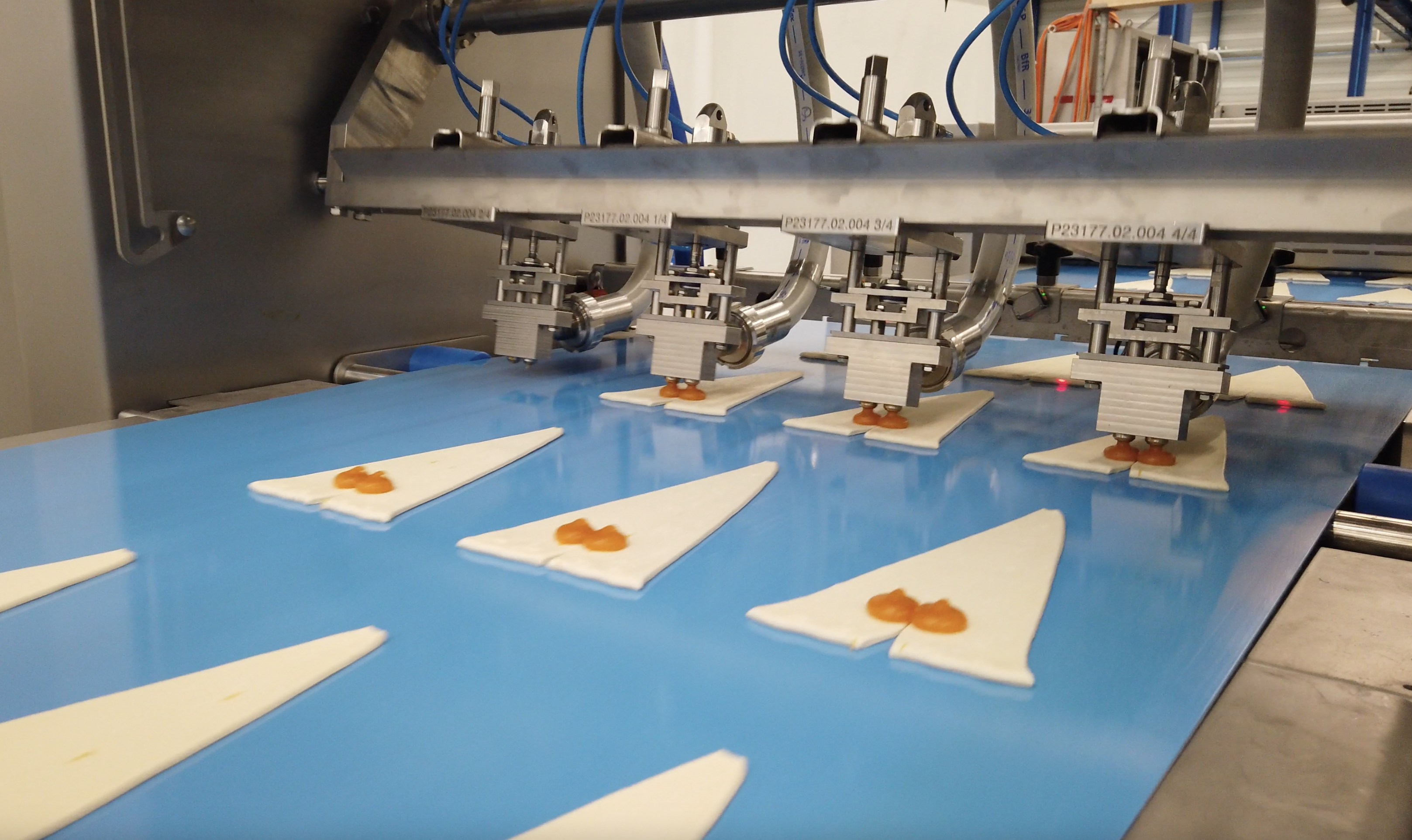 Your croissants can be filled with a wide variety of fillings; sweet or savory, semi-liquid and solid fillings, but also double fillings (duo-color) fillings with particles like ham, apple, etc. We can deliver the right depositing solution for your specific type of filling as we are able to process a large variety of filling materials. It is also possible to inject your fillings after baking when required. In that case we can deliver our injecting system that is extremely accurate.
