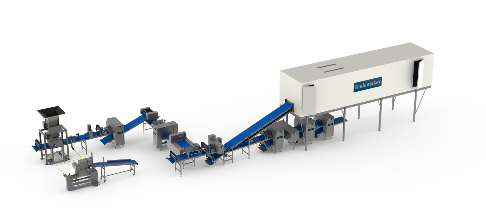 Rademaker laminators are custom-built using standard components, offering flexible configurations tailored to your specific application. Whether you need a block processor or a fully automated laminator, our systems comply with international hygiene standards and can be configured in various layouts (L-shape, U-shape, Z-shape, etc.).